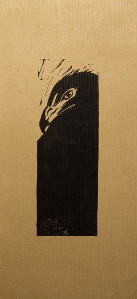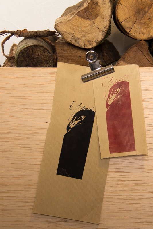 Un oiseau inconnu linogravé en noir, rouge, sur papier kraft, papier de soie…