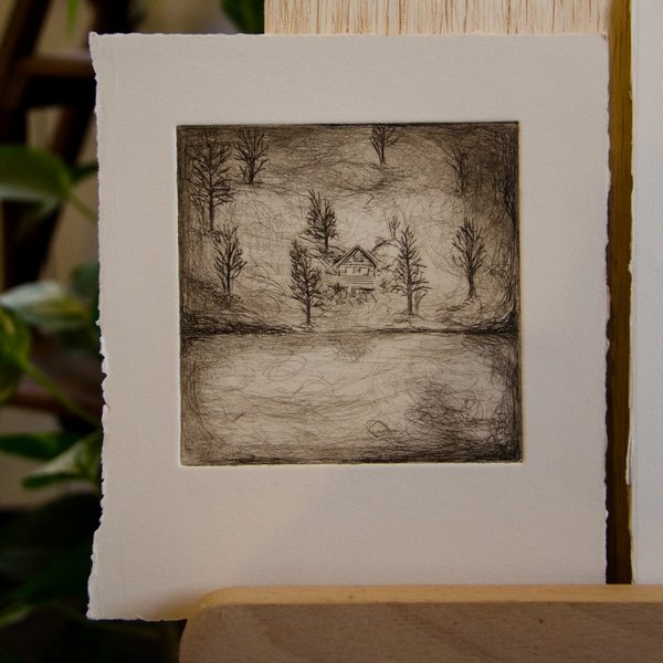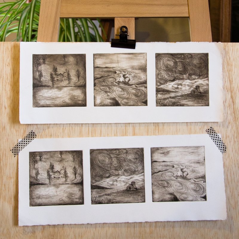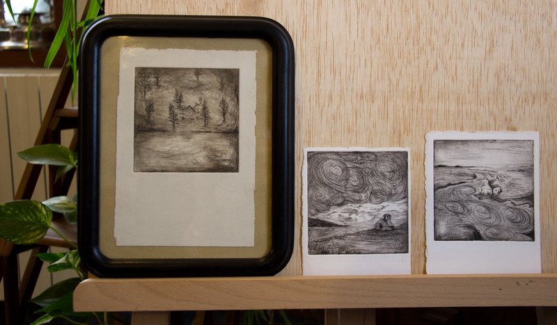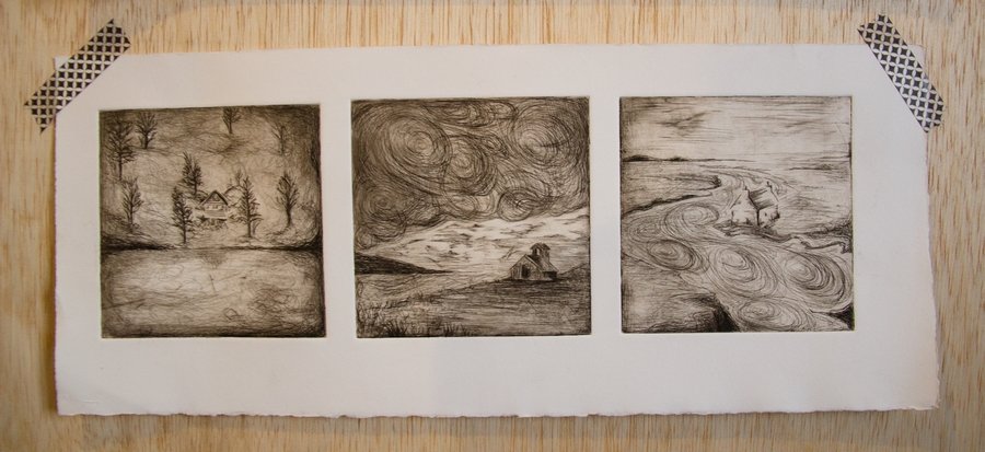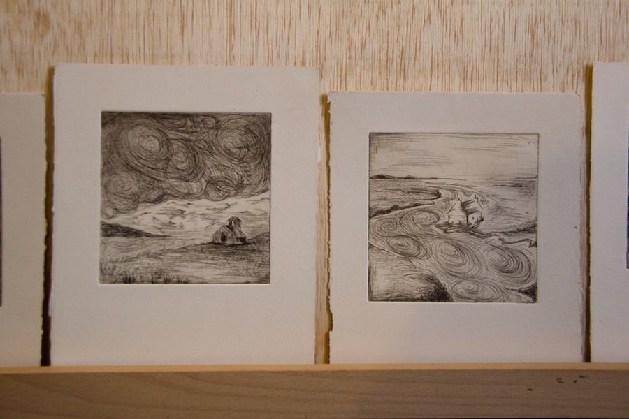 Gravures à la pointe sèche sur rhénalon, encre noire et sépia. L’essuyage de cette encre joue énormément sur le résultat final comme on le voit ici.