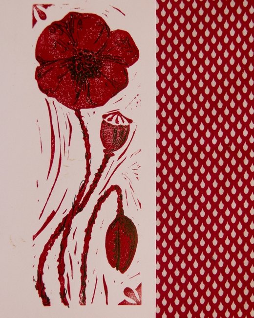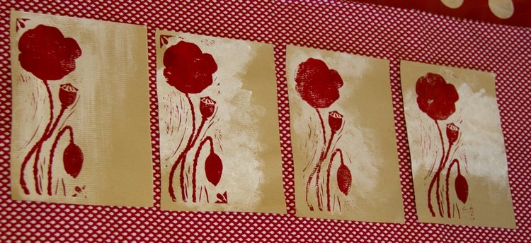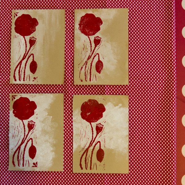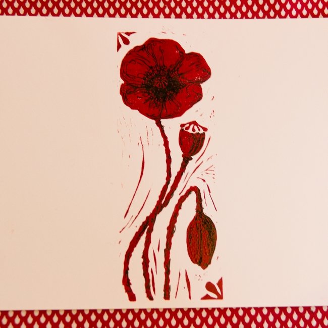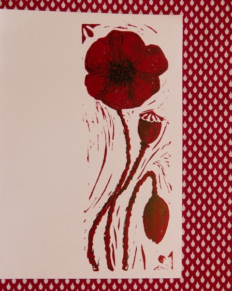 Période de vacances oblige, pas de presse… (problème bientôt résolu ??? 🙂 ) J’ai donc opté pour la linogravure, le tout imprimé à la cuillère en bois… Impression imparfaite mais j’aime beaucoup ces imperfections-là… Impression en rouge carmin (Désolée! Pas de rouge poppy sous le coude!) et détails dessinés à l’encre noire…